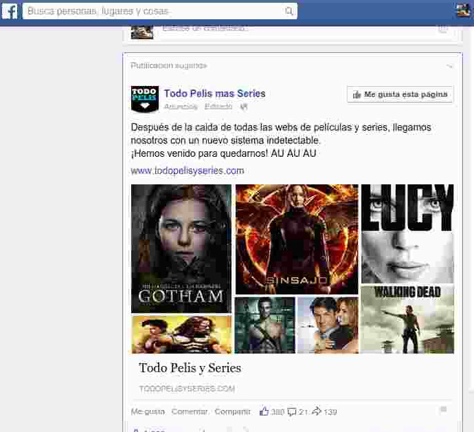 Nota 1: Si algo empieza a venderse así…cuidado. Es obvio que TODAS las webs de películas y series no Escritorio 1_044se han caído, y muy dudoso que exista “un nuevo sistema indetectable”. Además ¿un anuncio en Facebook de una actividad ilegal (compartir enlaces de películas)…? Primeras indicaciones que esto es para atraer incautos.