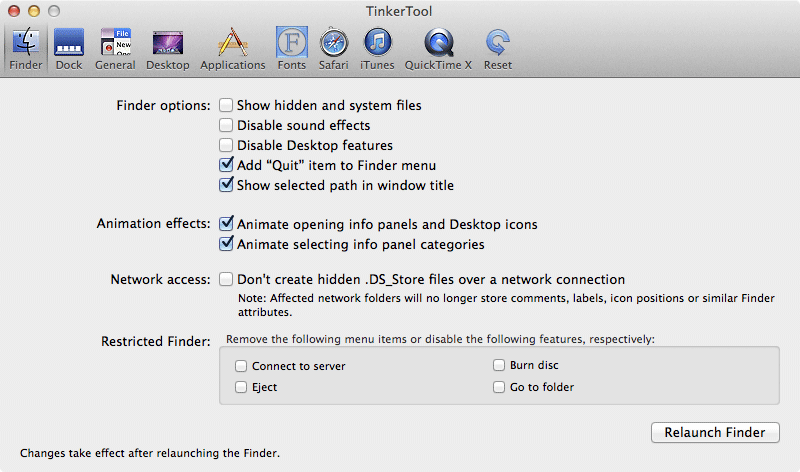 Tinker: otra herramienta para personalizar el sistema. Podéis ver las funciones aquí. Opciones para Finder, Safari, el Dock, aplicaciones etc etc.