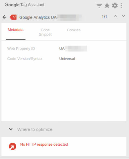 Hace unos días estuvimos arreglando un error de un cliente con este módulo, y os vamos a dejar cómo resolverlo. El error era que conseguíamos instalar el módulo, activarlo y poner la ID de Analytics, pero cuando usábamos el Tag Assistant de Google para ver si la etiqueta estaba bien daba el error: NO HTTP response detected.