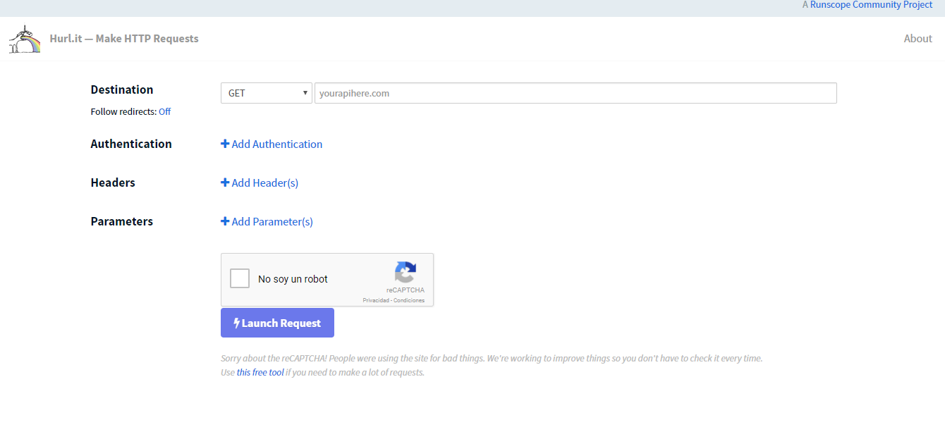 Elije el tipo de petición, la autenticación, la cabecera, los parámetros y mándalo. Si has mandado varios te pedirá cumplimentar un reCaptcha. Así de fácil.